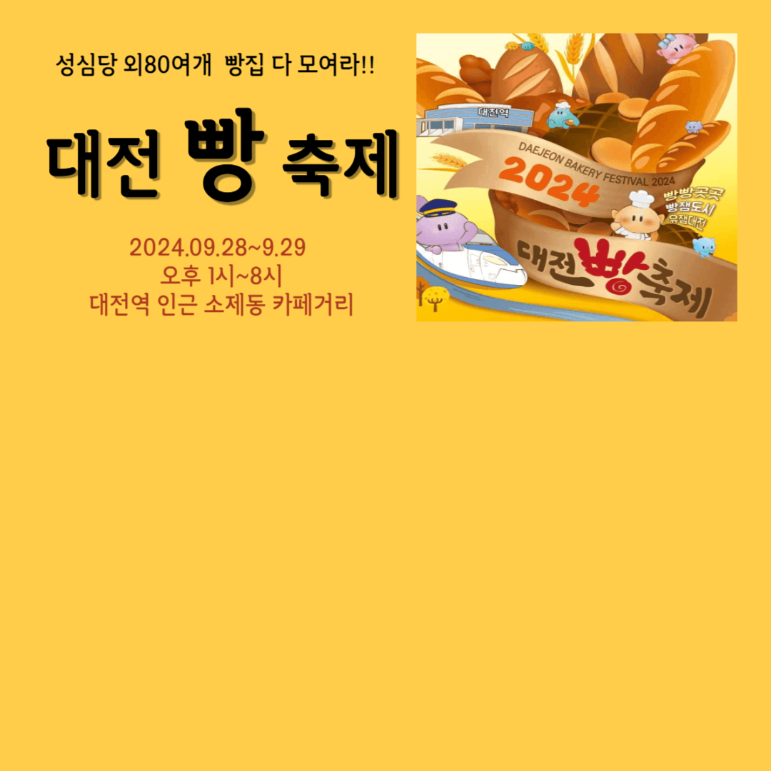 2024 대전빵축제는 성심당 외 80여곳의 참여업체가 있으며 초대가수(라이업) 및 이벤트 일정이 다양하게 준비되어있습니다. 축제 일정 확인하기 참여업체 목록 확인하기 오시는길 주차장안내
